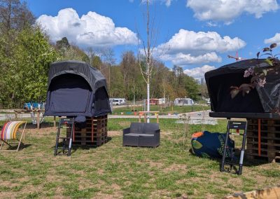 Im Zentrum, dem schönsten Teil unseres neuen Campingplatzes, befindet sich seit neuestem unsere „Dachzeltoase“. Hier können sie entspannt einen Aufenthalt in einem unserer fünf unterschiedlichen Dachzelte genießen und sich mit dem Thema intensiv befassen. Wir haben fünf verschiedene Dachzelte der des Herstellers Qeedo zur Auswahl: